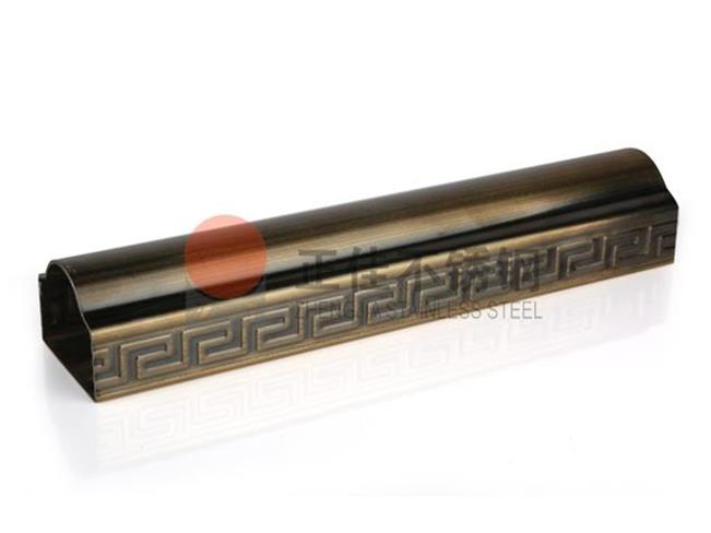 本款產品是新型的藝術不銹鋼裝飾管,在不銹鋼裝飾管的表面壓出回形花紋再鍍銅使不銹鋼管表面呈現古銅色,可以定制各種個性化花紋。